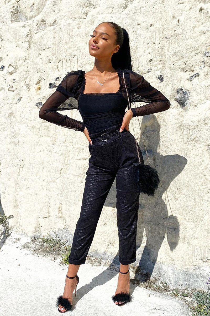 Get ready for party season in our Aasia Black Belted Croc Print Tapered Trousers! Featuring double ring belt, croc print detail and high waist design! Style with a bodysuit and heels!